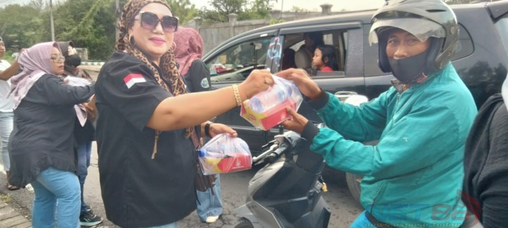 Kabiro Media Cakrawalaone, Lusi Afriani, menginisiasi aksi sosial berbagi takjil kepada masyarakat pengendara di Jalan Raya Tlanakan, Pamekasan, Minggu (15/3/2026). 300 takjil dan 30 bingkisan sembako dibagikan kepada masyarakat.