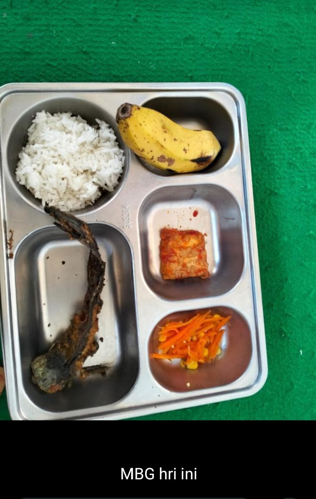 Apa saja menu MBG di Kecamatan Sumber Wringin. Tampak dalam foto yaitu Lele, Nasi, Buah Pisang, Tempe dan Sayur wortel.