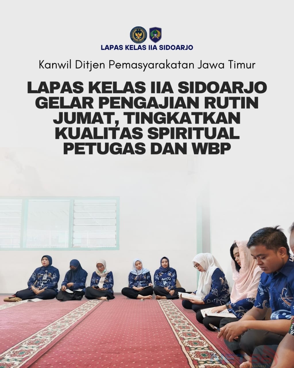 Lembaga Pemasyarakatan Kelas IIA Sidoarjo kembali melaksanakan kegiatan pengajian rutin pada hari Jumat, sebagai salah satu program untuk meningkatkan kualitas spiritual petugas dan warga binaan pemasyarakatan (WBP).