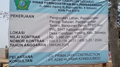 Terlihat ada di dugaam pelanggaran proyek milik Dinas perindustrian dan perdagangan Pemerintah kabupaten Sidoarjo yang bertuliskan papan proyek mengerjakan pengurukan lahan, pemasangan paving, saluran, pembangunan, tenant, bangunan panel, TPST, dan IPAL, SIHT Kabupaten sidoarjo lokasi Desa Candipari dengan nilai kontrak : Rp. 3.990.281.873.33. bernomor kontrak : 000.3.3/09.25.01/438.5.20/2024. Tahun anggaran 2024. Tidak menyebutkan sumber dana darimana dan lama waktu pekerjaan.