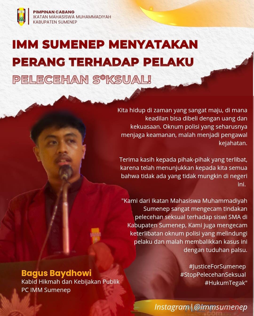Sementara itu, PC IMM Sumenep menyatakan sikap tegas terhadap segala bentuk kekerasan dan pelecehan seksual, khususnya yang menimpa pelajar. IMM juga menyoroti pentingnya profesionalisme aparat dalam menangani perkara sensitif yang menyangkut masa depan korban.