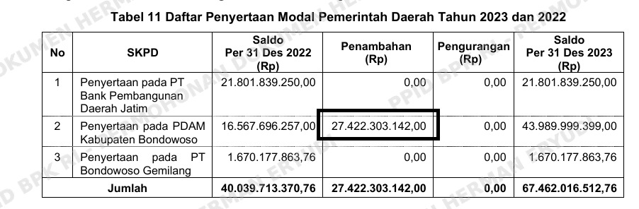 Dalam tabel 11 LHP BPK tersebut dijelaskan bahwa saldo penyertaan modal Pemkab kepada PDAM Bondowoso per 31 Desember 2022 adalah sebesar Rp. 16.567.696.257 (enam belas milyar lima ratus enam puluh tujuh juta enam ratus sembilan puluh enam ribu dua ratus lima puluh tujuh juta rupiah).