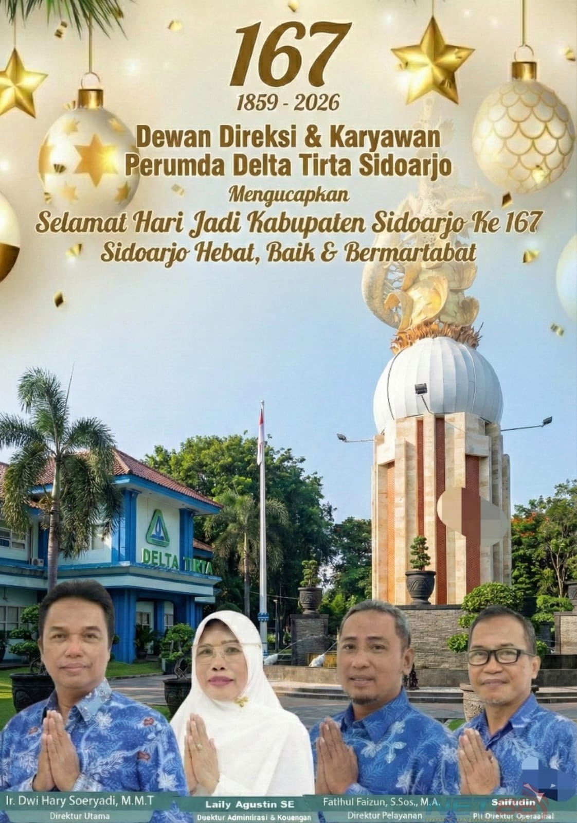 Beranda NEWS Perumda Delta Tirta Sidoarjo Mengucapkan Selamat Hari Jadi Kabupaten Sidoarjo ke-167, "Sidoarjo Hebat Baik Dan Bermartabat" NEWS Perumda Delta Tirta Sidoarjo Mengucapkan Selamat Hari Jadi Kabupaten Sidoarjo ke-167, “Sidoarjo Hebat Baik Dan Bermartabat”pimred20/01/202620/01/2026 BACA JUGA :Bapas Pamekasan Kelas II-A Lakukan Monitoring