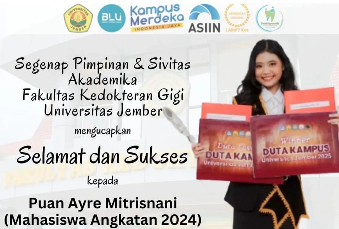 Bondowoso, NET88.CO – Setiap generasi memiliki bintang yang lahir untuk bersinar lebih terang dari yang lain. Di antara gemerlap prestasi Mahasiswa Universitas Jember (UNEJ), satu nama melesat menjadi sorotan publik Puan Ayre Mitrisnani, mahasiswi Fakultas Kedokteran Gigi yang berhasil menorehkan sejarah sebagai Winner Putri Duta Kampus 2025 sekaligus Duta Kampus Favorit.