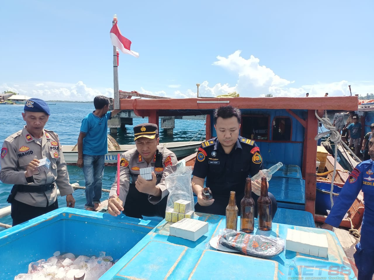 Adapun barang bukti yang berhasil diamankan oleh petugas adalah 5 Botol Kaca Bekas, 3 Ton Ikan Jenis Campuran, 1 Unit Kapal beserta isinya, beberapa batang Dupa, kotak Korek api ABC dan Sumbu mercon dan 1 Pasang Sandal swallow